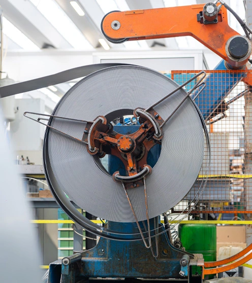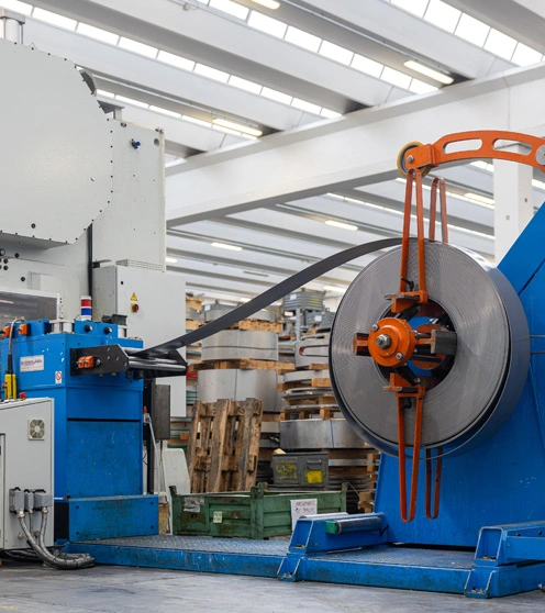 Macchinario che gestisce lo svolgimento controllato dei coil di lamiera. La macchina alimenta automaticamente le linee di tranciatura, assicurando corretta tensione del materiale e continuità di produzione.